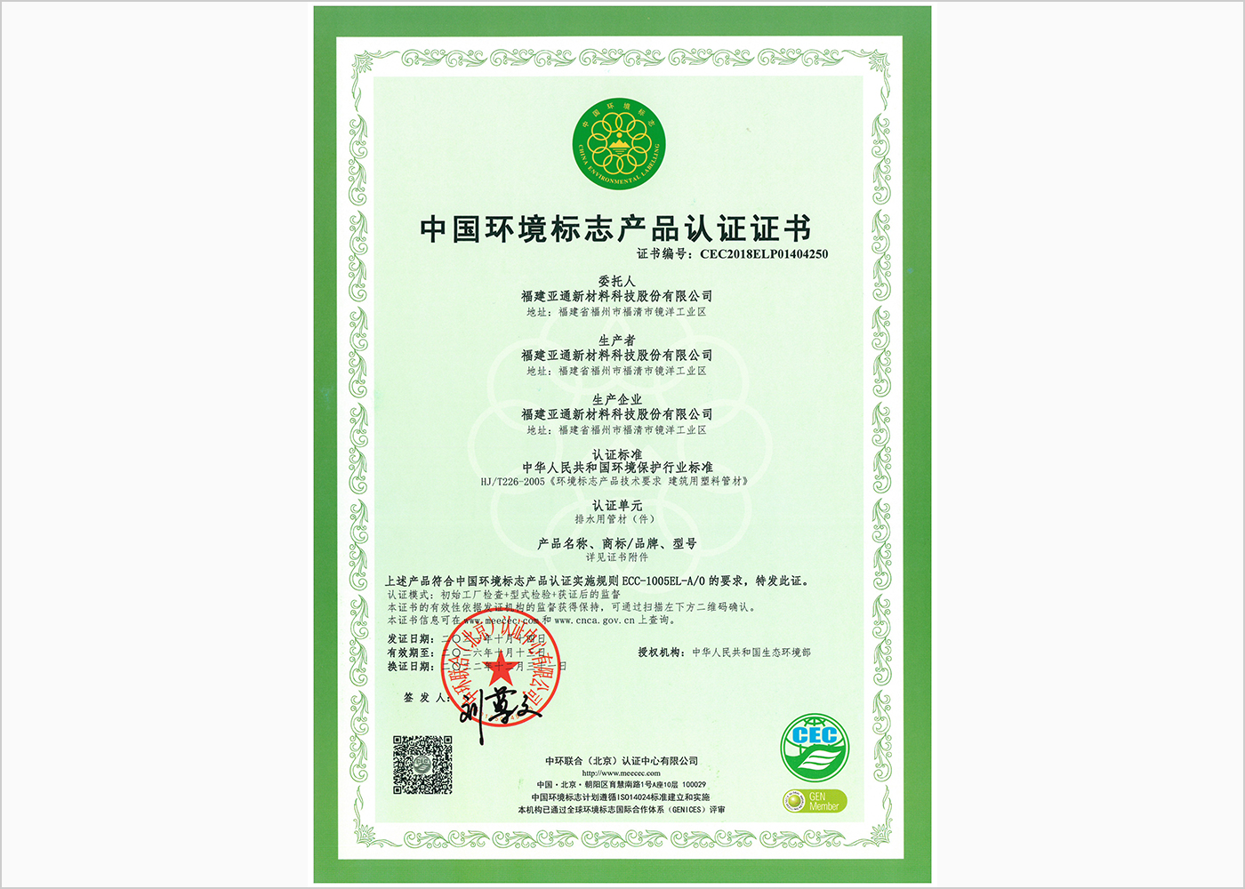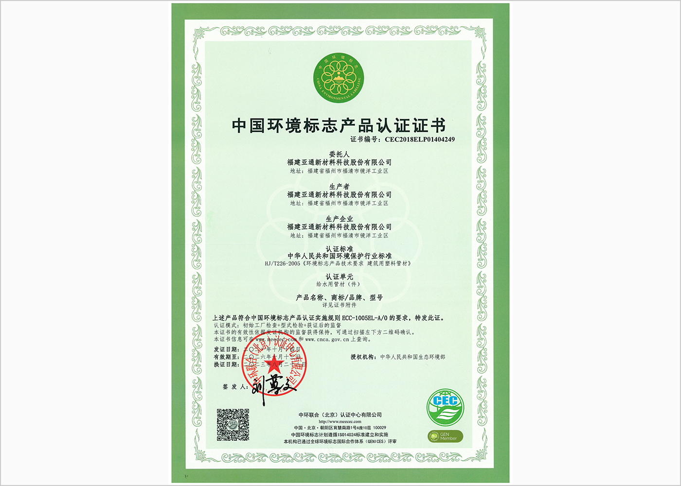 給水管系列中國環(huán)境認(rèn)證產(chǎn)品證書