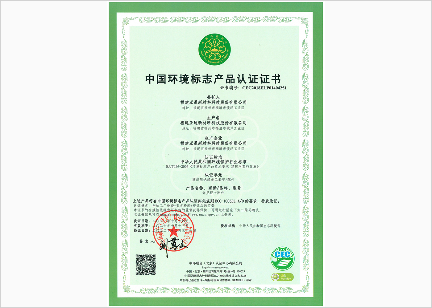 建筑電工管中國環(huán)境認(rèn)證產(chǎn)品證書