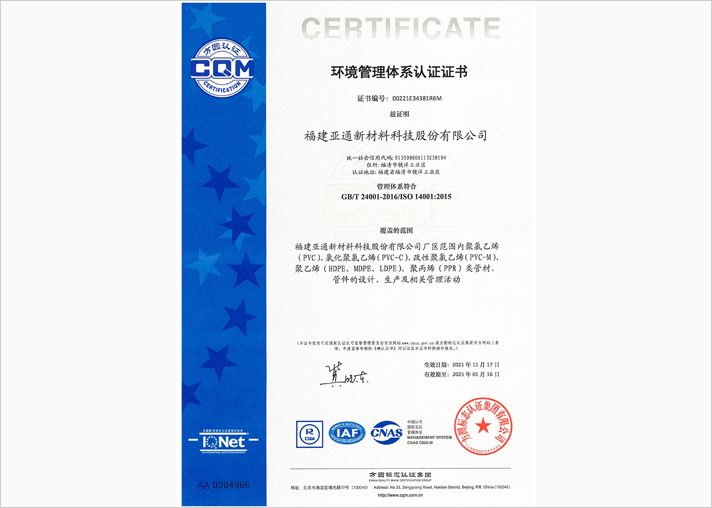 環(huán)境管理體系認(rèn)證證書