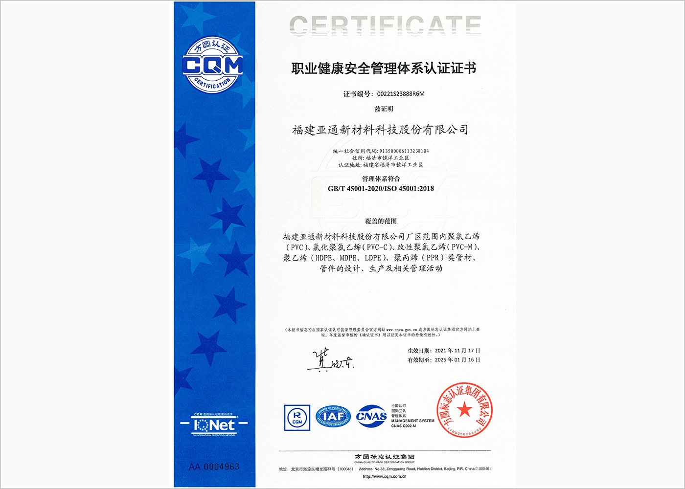 職業(yè)健康安全管理體系認(rèn)證證書