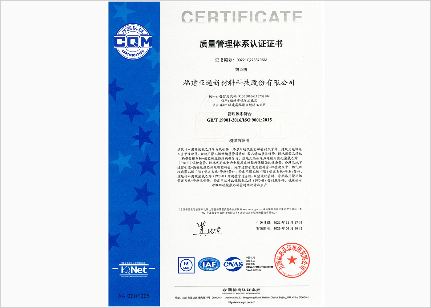 質(zhì)量管理體系認(rèn)證證書