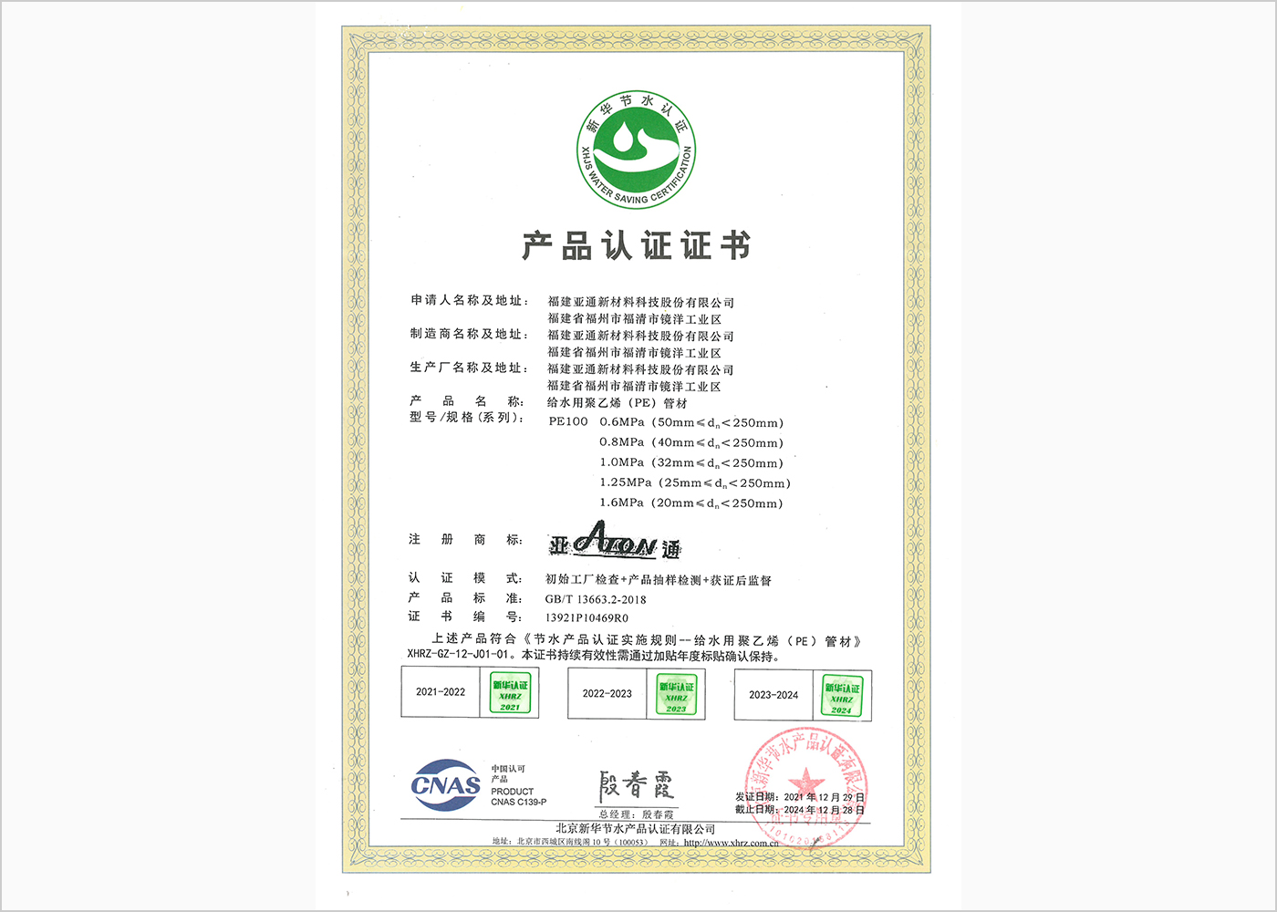 PE管新華節(jié)水認(rèn)證證書
