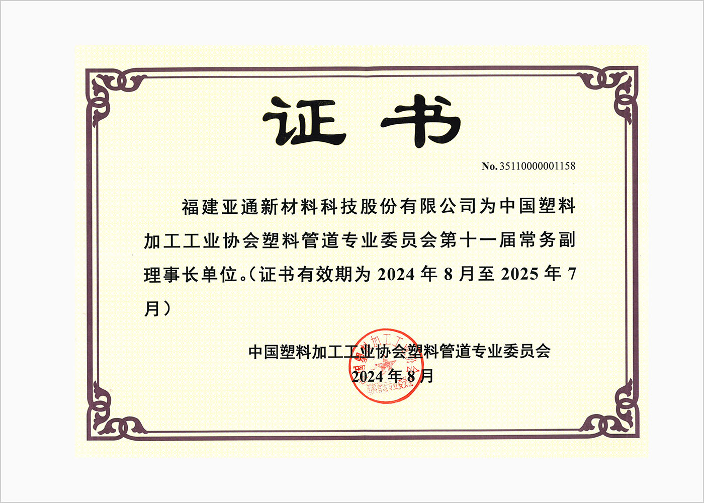 中國塑料加工工業(yè)協(xié)會(huì)第十一屆副理事長單位證書