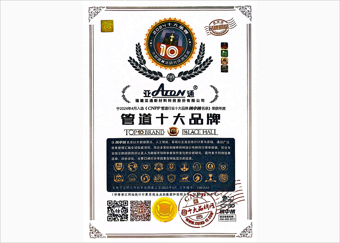 中國管業(yè)十大品牌證書